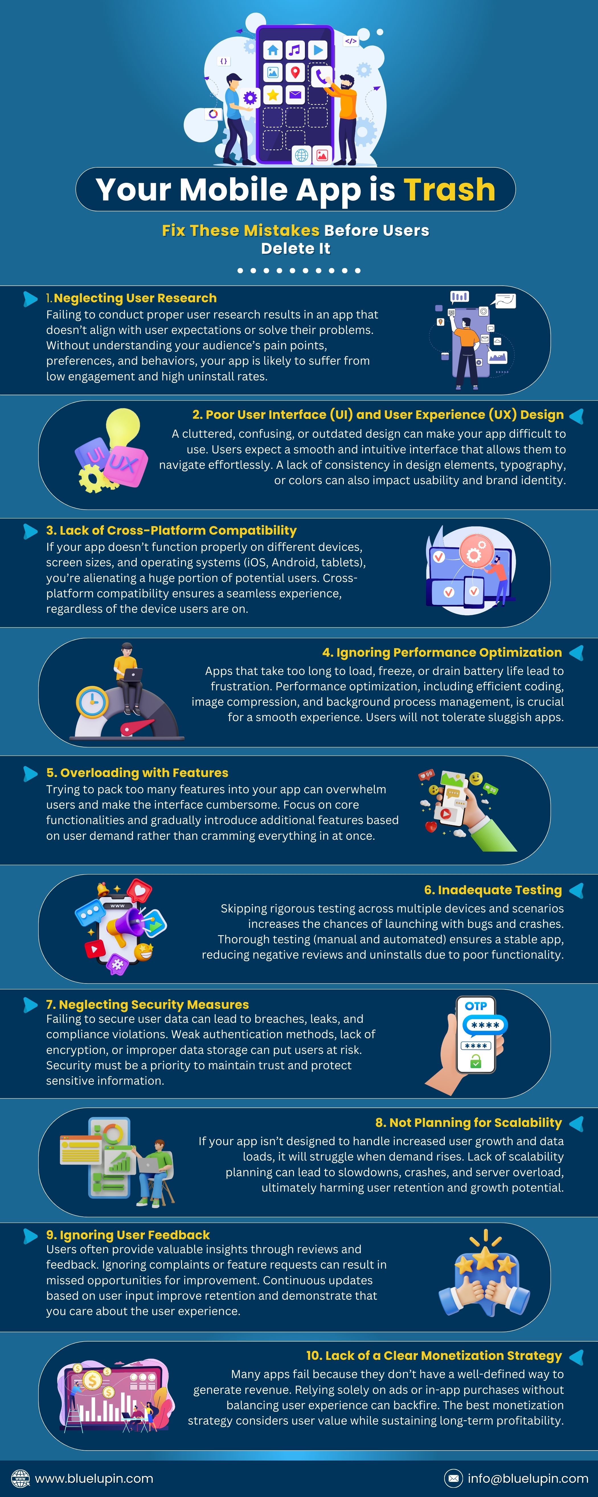 A slow or buggy app is a guaranteed way to frustrate users. Performance issues, crashes, and battery drainage will quickly send them looking for an alternative.