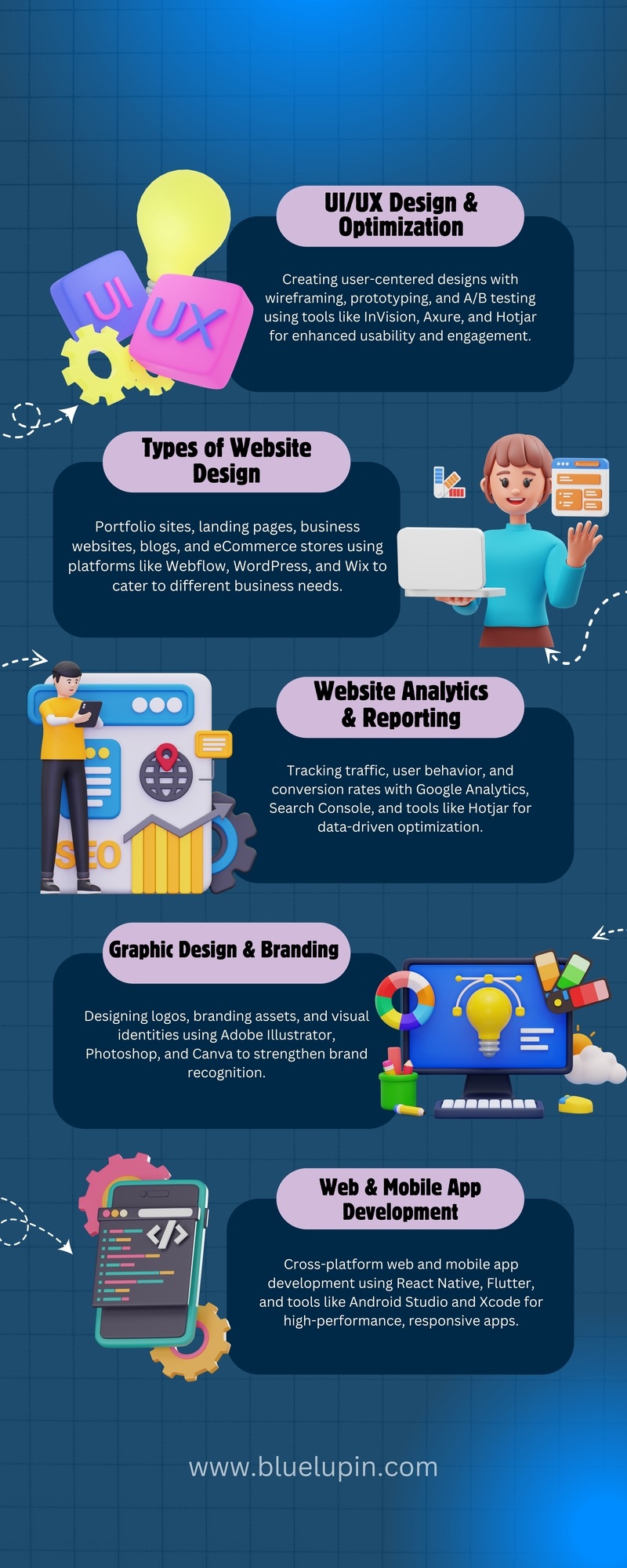 For a quick overview of the essential services a website design company can offer your business, take a look at this infographic below. It summarizes the core services and how they contribute to your business’s digital success.